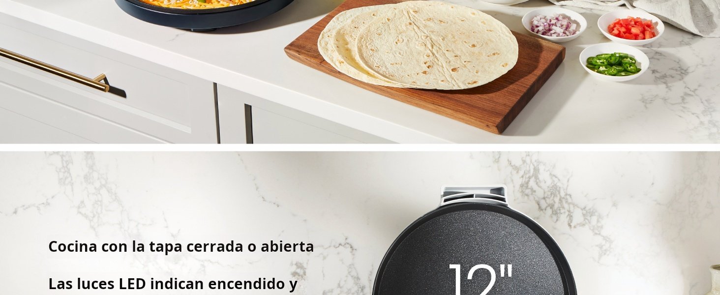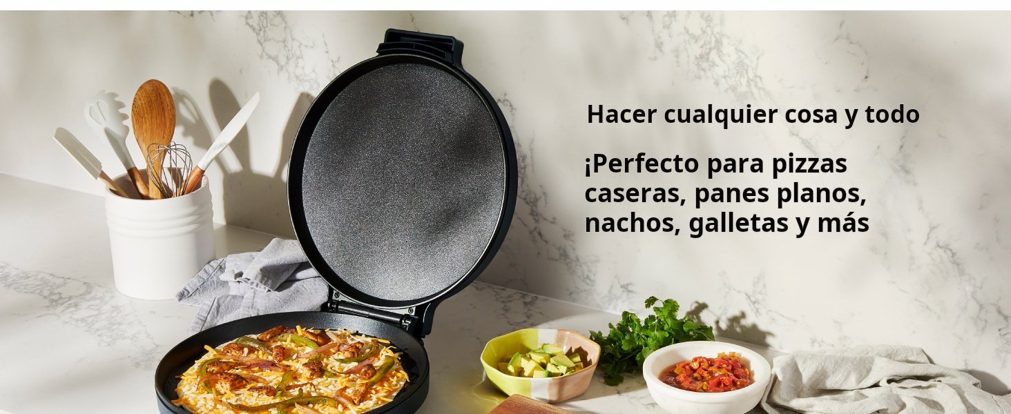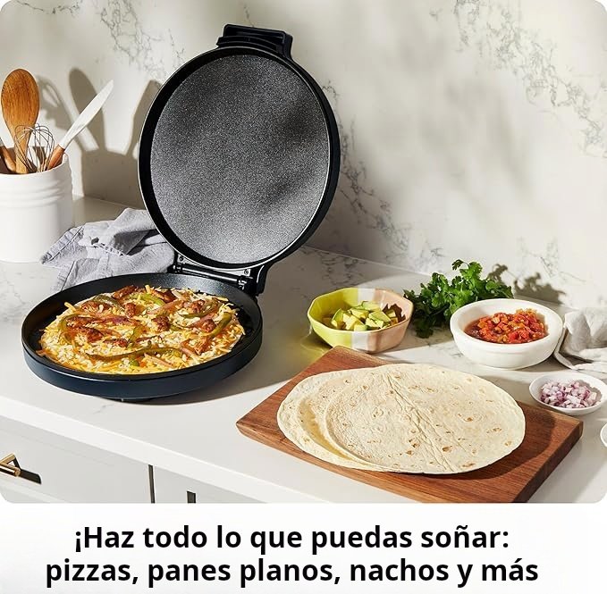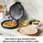 Horno eléctrico para pizza que también funciona como parrilla para tortillas, omelets, panqueques, sándwiches, crepes y quesadillas.