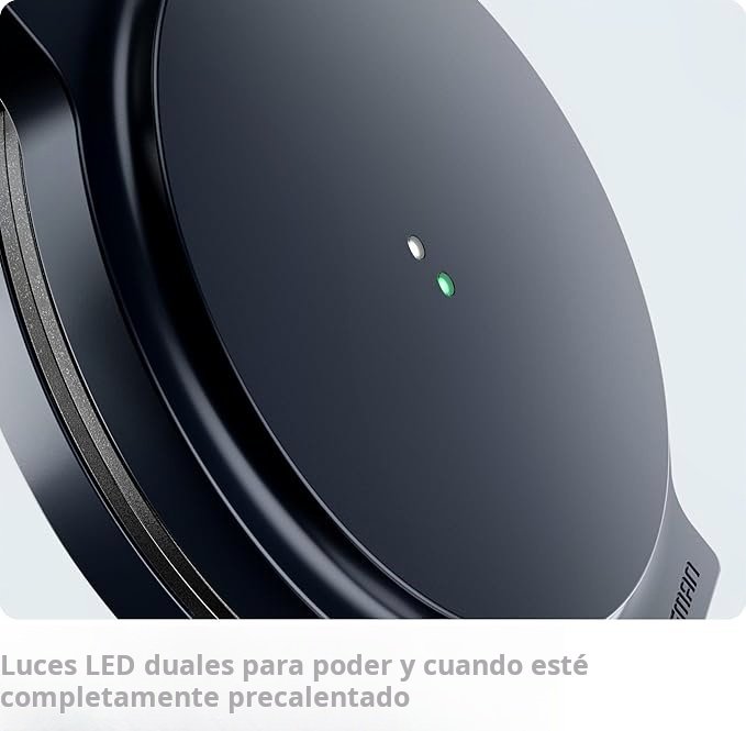 Indicadores LED que muestran encendido y precalentado; listo para usar en aproximadamente 3 minutos.