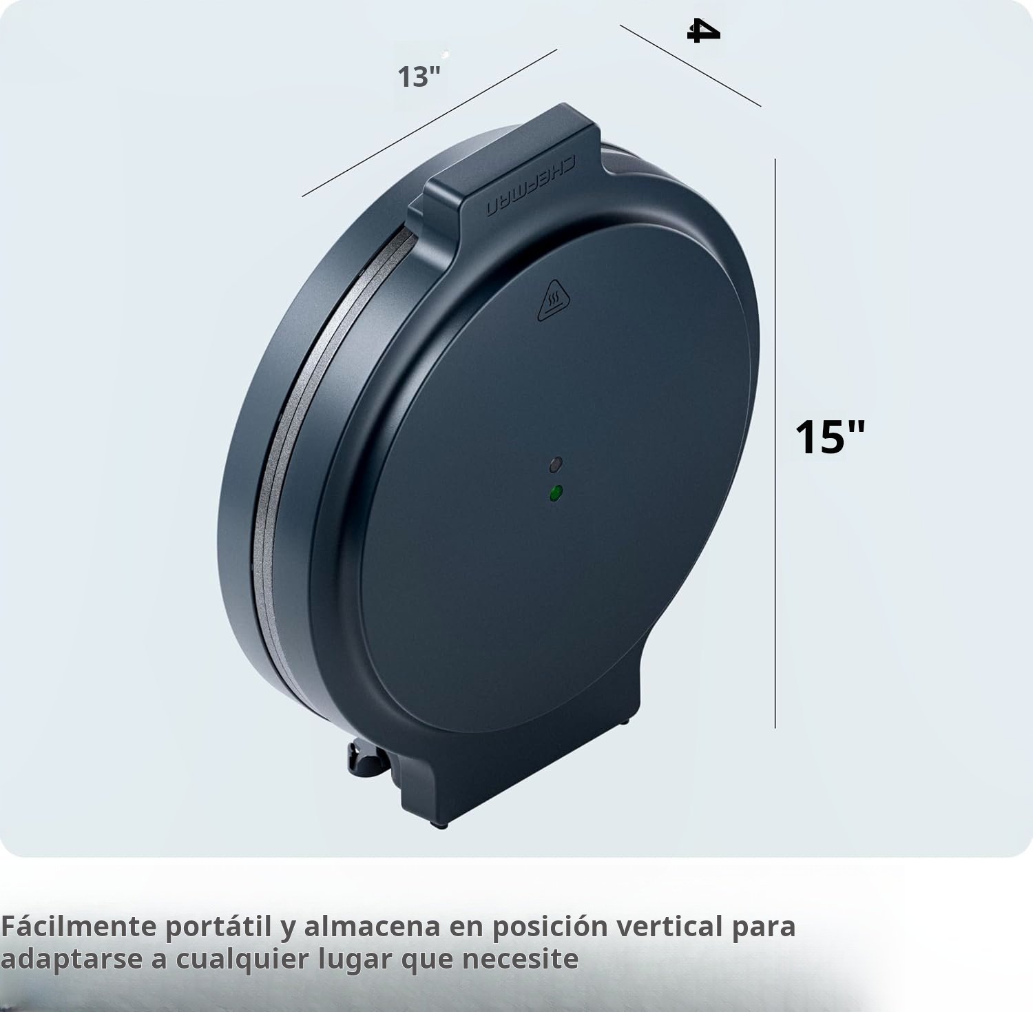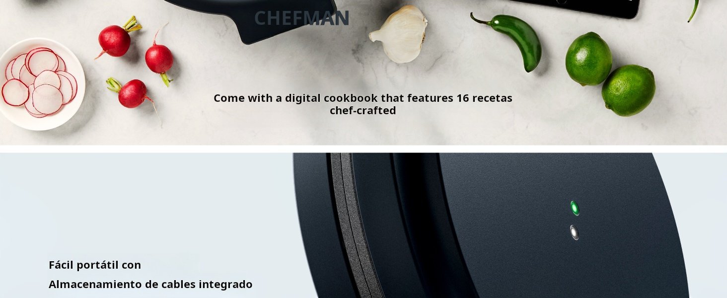 Diseño moderno con almacenamiento de cable y posición vertical para ahorrar espacio. Certificación cETL y garantía de 5 años Chefman (1440W, 120V).
