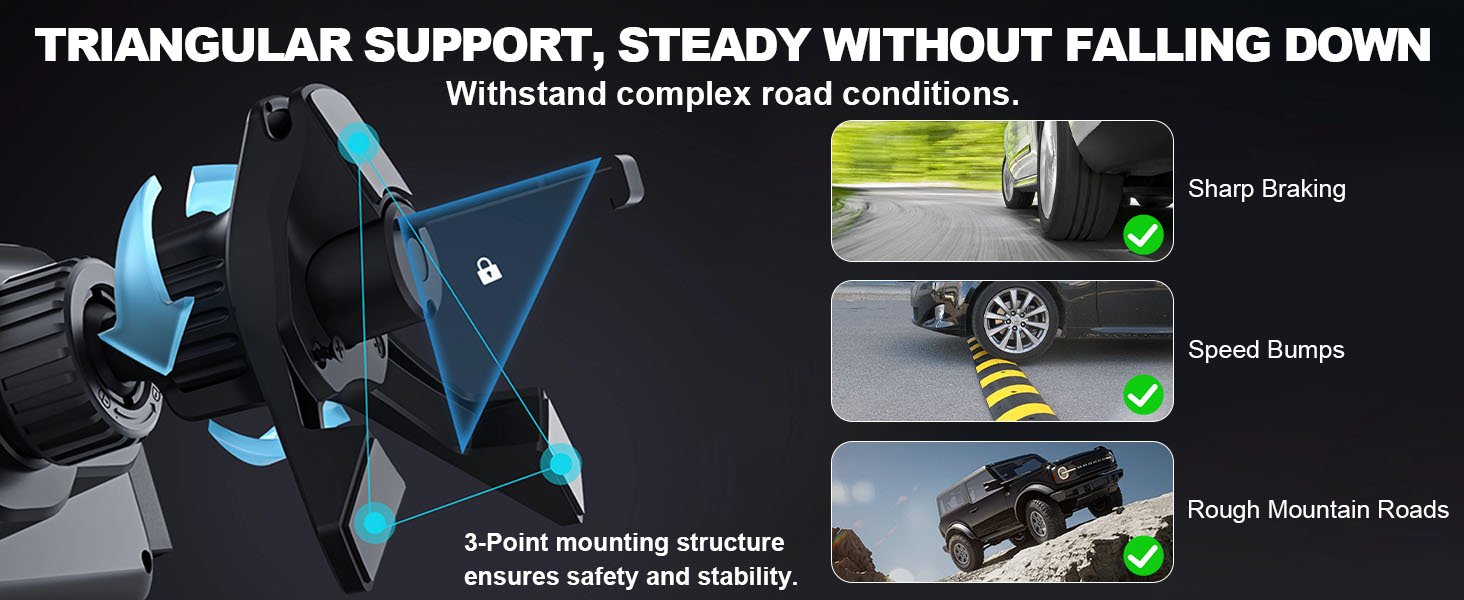 Diseño triangular que mantiene el teléfono firme incluso en carreteras irregulares.